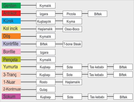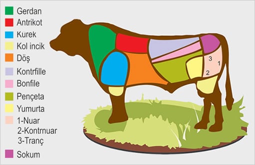 Gerdan: Lifli bir ettir, yağsızdır, kıymada kullanılır. Kuşbaşı yapmaya kalkarsanız verim alamazsınız, zira sinirlidir, lezzetli olmaz.